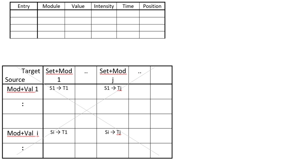 In the table format, the discrete combinations of values and intensities, which were described in the brain representation, could be replaced by combined new values. Thus, there is no a-priori need to select only one intensity activation for a given brain value. Furthermore, the entire hierarchical structure could be cancelled and, thus, all associations between entities and values would be feasible, without hierarchical limitation. For the sake of further abstraction away from the strict brain structuring, we would also replace the term brain module with the more abstract term – entity. Thus, we talk about values of entities instead of intensities of values of brain modules.