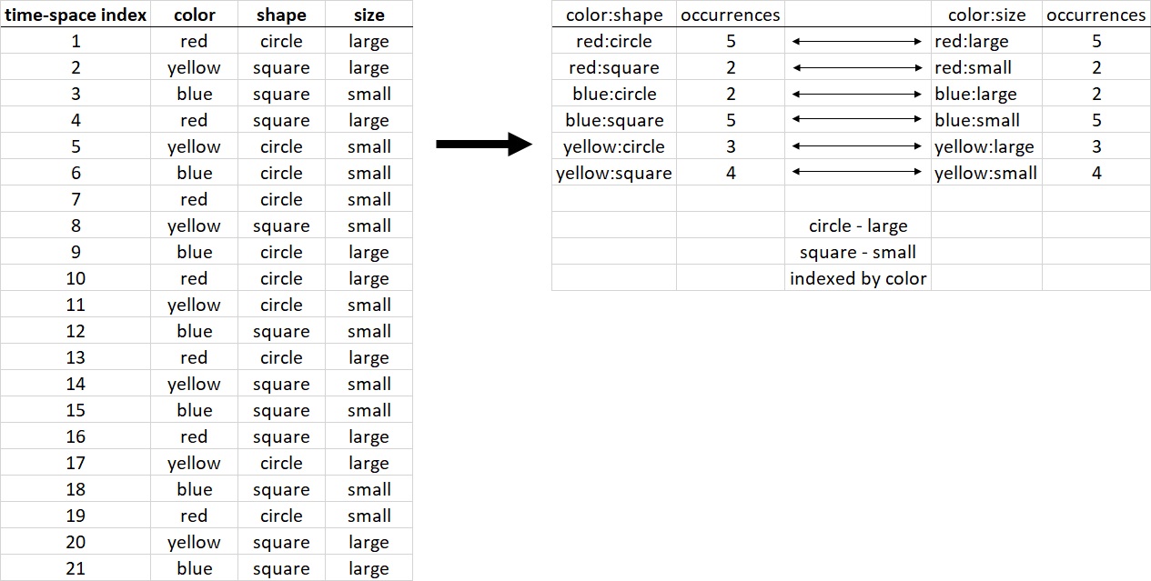 The table on the left is composed of entries, which could have been derived from a temporal index (e.g. order of “sensation” or input) and three entities: color, shape and size. The association between the entities might be difficult to notice. The table on the right shows the occurrences after re-indexing based on the entity of color. The association between shape and size is now noticeable (and summarized at the bottom).