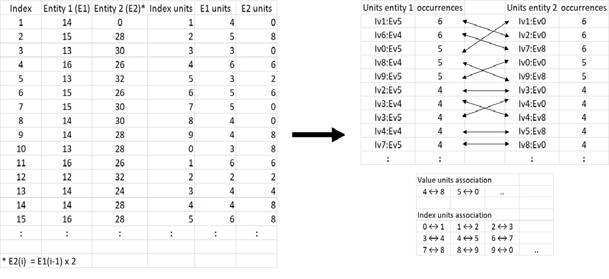 The data table on the left is comprised of two entities (E1 and E2) and a running index. E1 values were selected randomly between 10 and 19 with a normal distribution (peaking at 15). E2 values were derived from E1 values with the formula: E2(i) = E1(i-1) x 2, where i is the index entry. Thus, the association of the two entities is between consecutive index entries. The left three columns of the data table show the values of the decomposed unit entities of the index, of E1 and of E2. The right top table presents the coupled occurrence counts of the values of the unit index entity (Iv) and unit E1 (Ev) on the right and of the unit index entity (Iv) and unit E2 (Ev) on the left. The arrows denote the underlying associations of the most frequent combinations. These associations are detailed as value associations and as index associations on the bottom right.