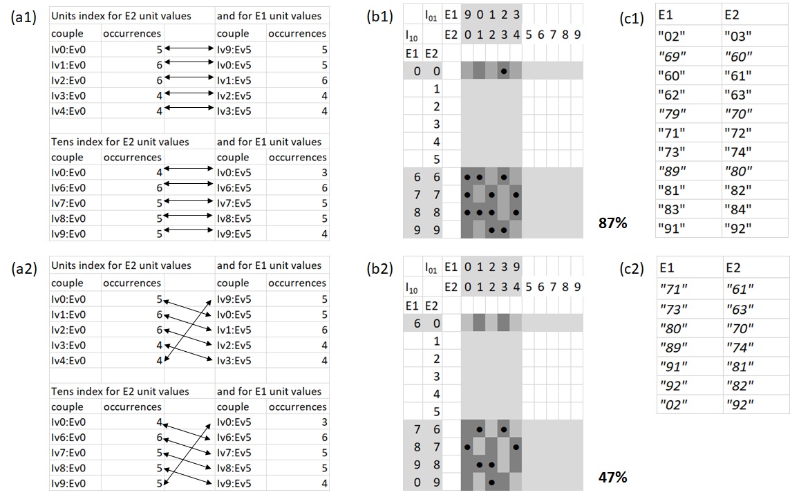 (b1) A graphical depiction of the possible recombination of the tens index values (rows) and of the units index values (columns). The E2 units values from the (index,E2) couples are presented internally and the E1 units values from the (index,E1) couples are presented externally, for both rows and columns. The values of E1 and E2, which were included in the (a1) highest occurring couples are presented and their related lines (for tens index values) and columns (for units index values) are marked in grey. For the sake of demonstration, the grey squares in which E2 value of “0” was found (based on the corresponding tens index value and units index value) are darkened. The black dots show where these “0” values were associated by a “5” value in E1, according to the corresponding tens index value and units index value (which, as was stated above, are the external ones, in both the rows and the columns). There is ~87% coverage of “0”s by “5”s for the possible association between the (index, E1) and (index, E2), which were presented in (a1).
