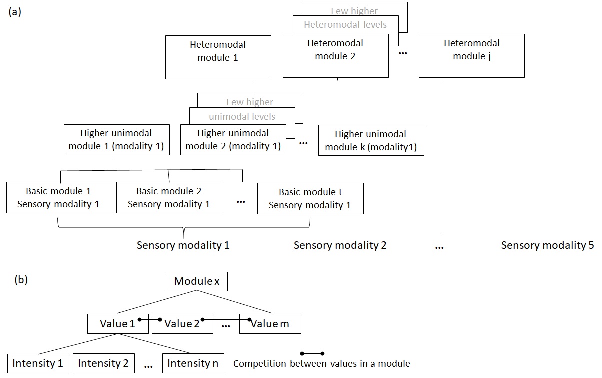 However, all together, the number and complexity of modules, in our sensory hierarchy, is rather limited. Figure 1a presents this structure schematically. Importantly, such a well structured hierarchy, promotes certain types of preferred associations – e.g. faster perception of words from combining specific auditory patterns. However, on the other hand, it poses limitations and reduces priority of other possible, less hierarchical, associations – e.g. between representations in different sensory modalities. Certainly, we can identify also associations between values of modules, which are not related by hierarchy. However, such hierarchy crossing association requires the recruitment of memory processes, such as working memory, which are much more limited in capacity.